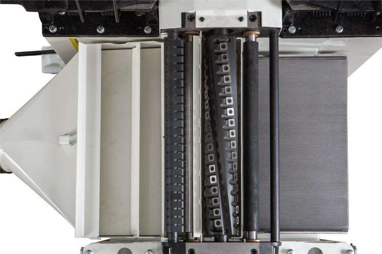 Конструкция станка – одна из самых удачных на рынке: широкое использование массивных чугунных деталей гарантирует точную работу без вибраций, при рейсмусовании верхний модуль целиком поднимается и не мешает ни работе, ни стружкоудалению, мощный трехфазный двигатель обеспечивает высокую производительность и надежность. Отдельного внимания заслуживает удобный эксцентриковый механизм регулировки положения столов, причем как подающего, так и принимающего, что необходимо при установке вала helical (опция)