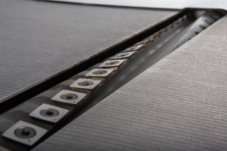Входящий в базовое оснащение вал helical снабжен твердосплавными режущими вставками. Он надежнее и проще в эксплуатации (не нужно никаких регулировок), а за счет последовательного входа ножей в заготовку работает тише и с меньшими вибрациями