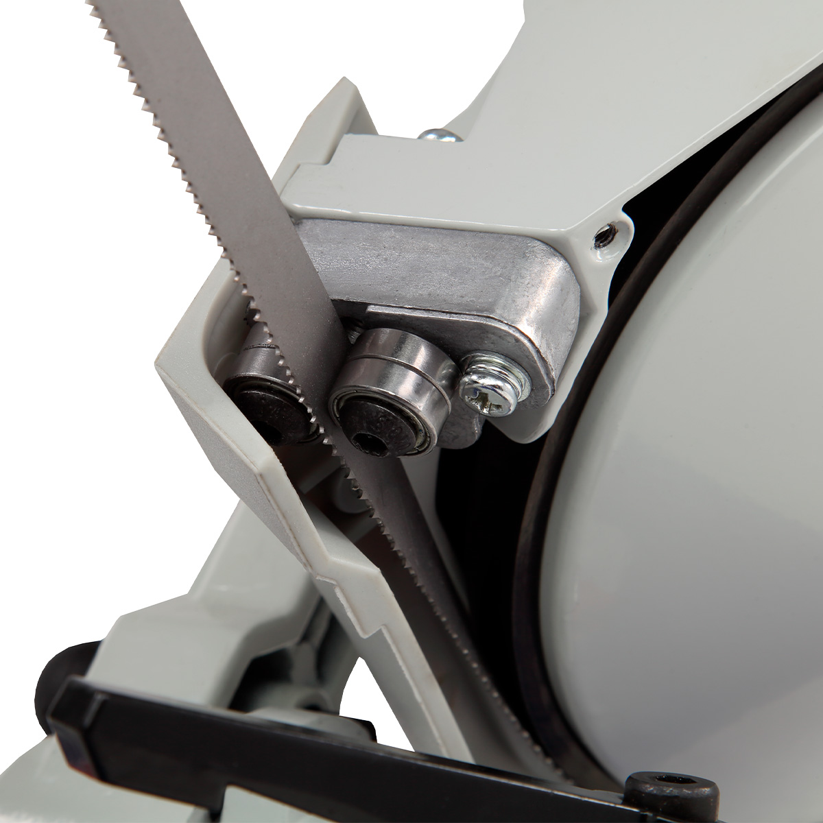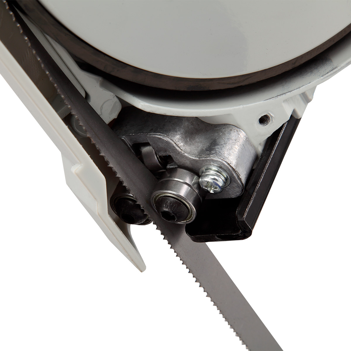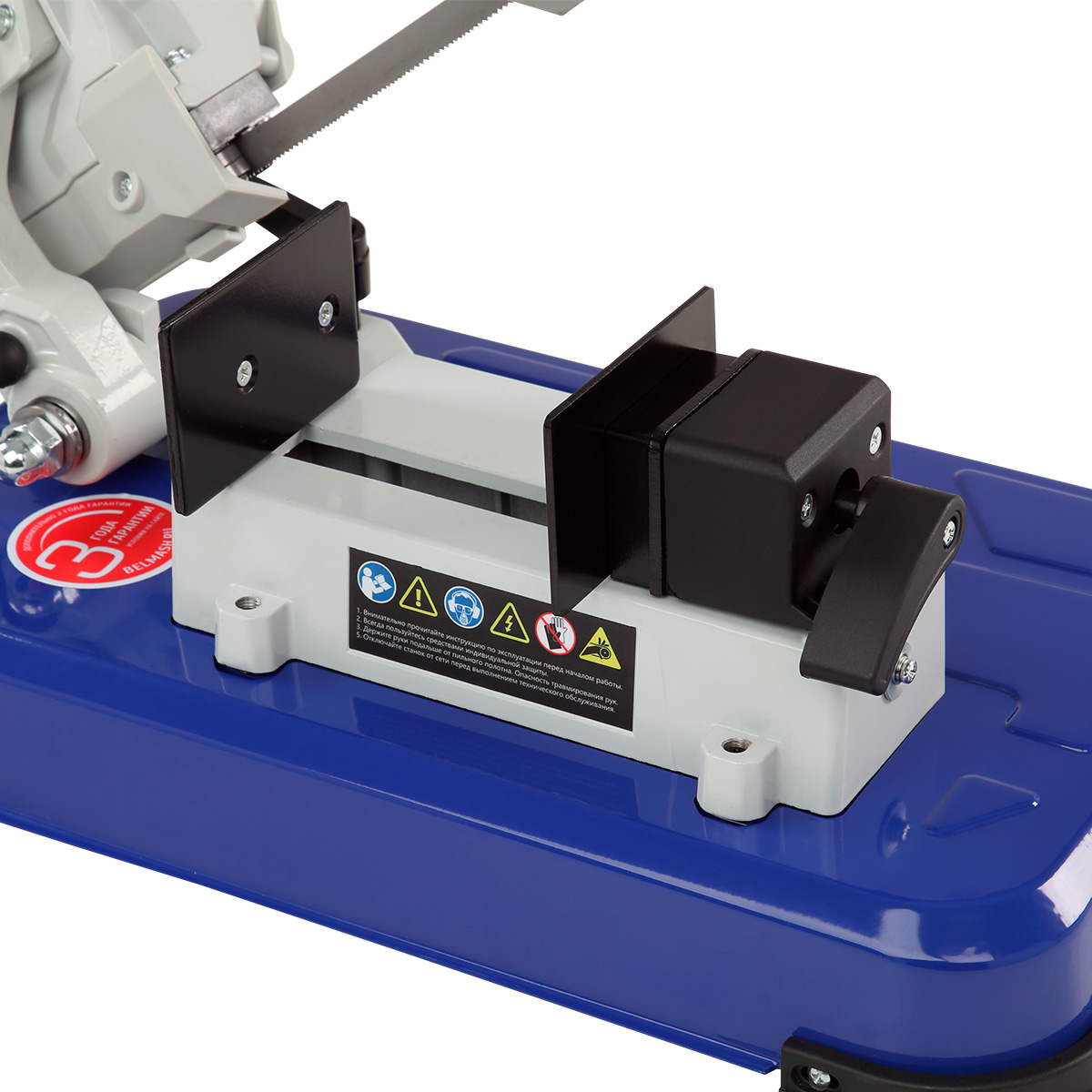 Натяжение пильного полотна осуществляется с помощью удобного рычага в задней части пильной рамы. Поднятие рычага вверх - усиливает натяжение полотна, опускание вниз - уменьшает. Перпендикулярность режущей кромки полотна обеспечивается за счет направляющих с подшипниками. Рабочее расстояние между двумя направляющими составляет 125 мм.
