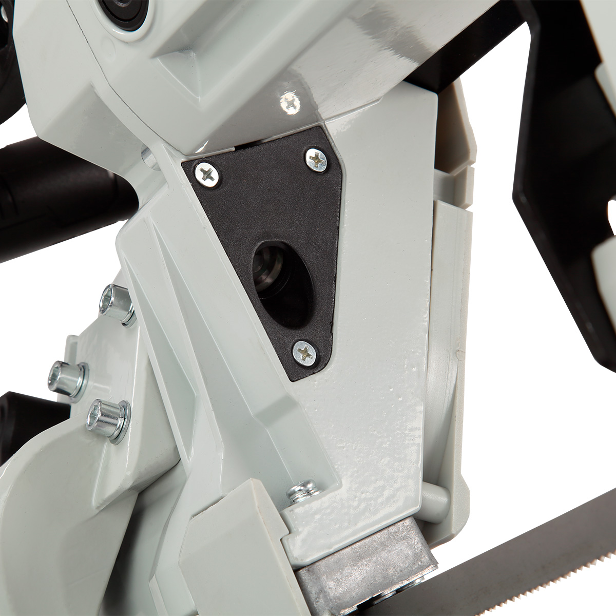 Светодиодная подсветка расположена над зоной распила, что помогает работать в помещениях с плохим освещением или в темное время суток. Кнопка включения подсветки находится в верхней части пильной рамы.