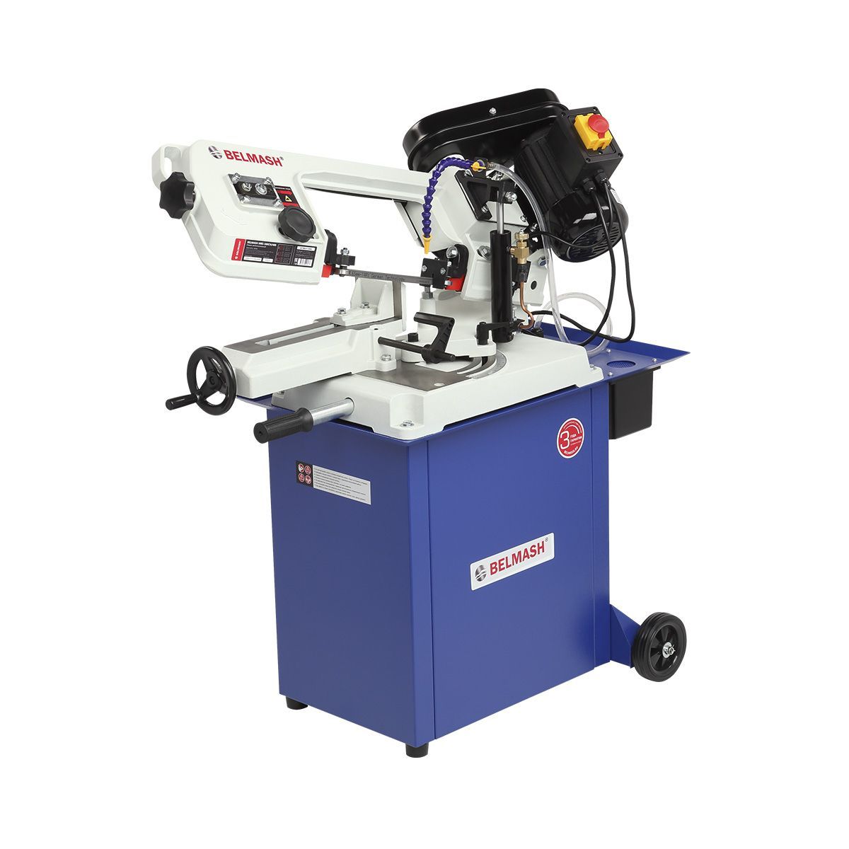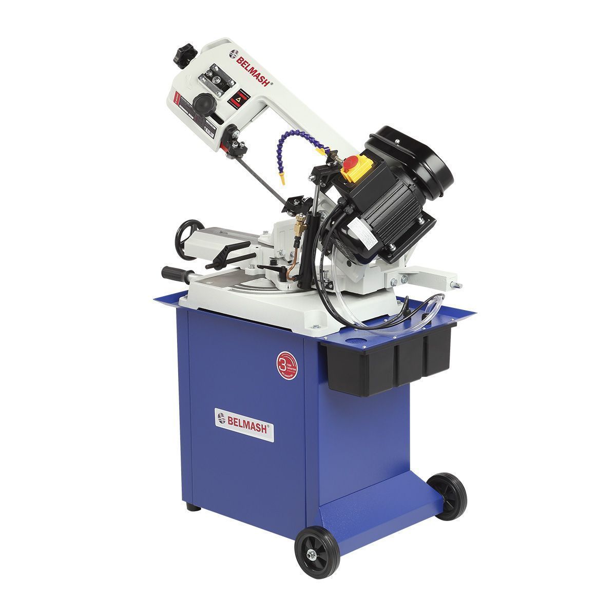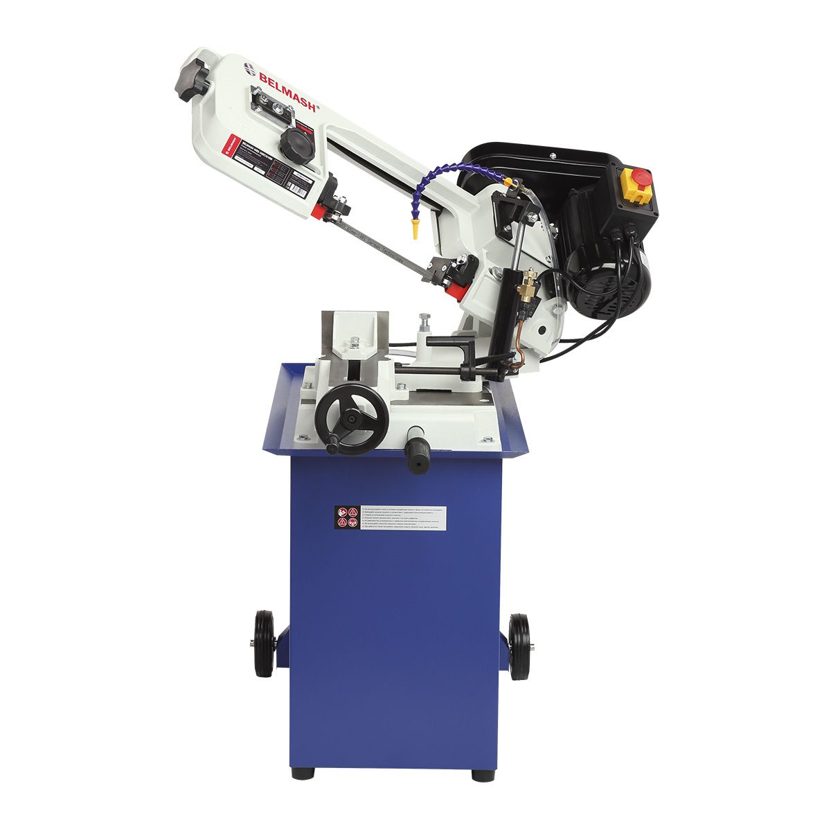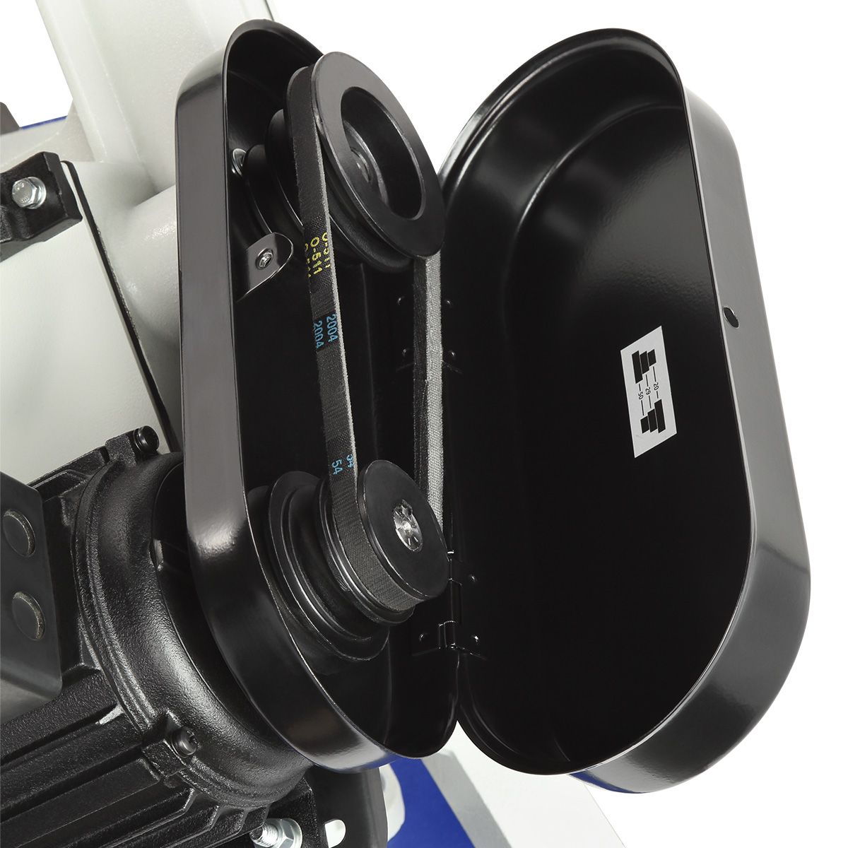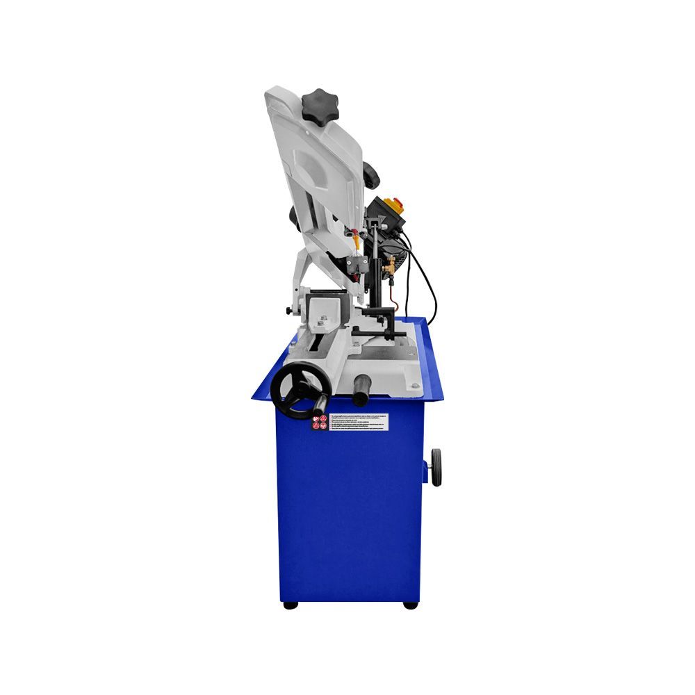 Станок оснащен мощным асинхронным двигателем 550 Вт, S1, работающим от сети 230/380 В. Переключение между тремя скоростями резания 20/29/50 м/мин осуществляется простым перекидыванием клинового ремня. Натяжение пильного полотна регулируется специальной ручкой, что обеспечивает стабильную работу и продлевает ресурс оборудования.