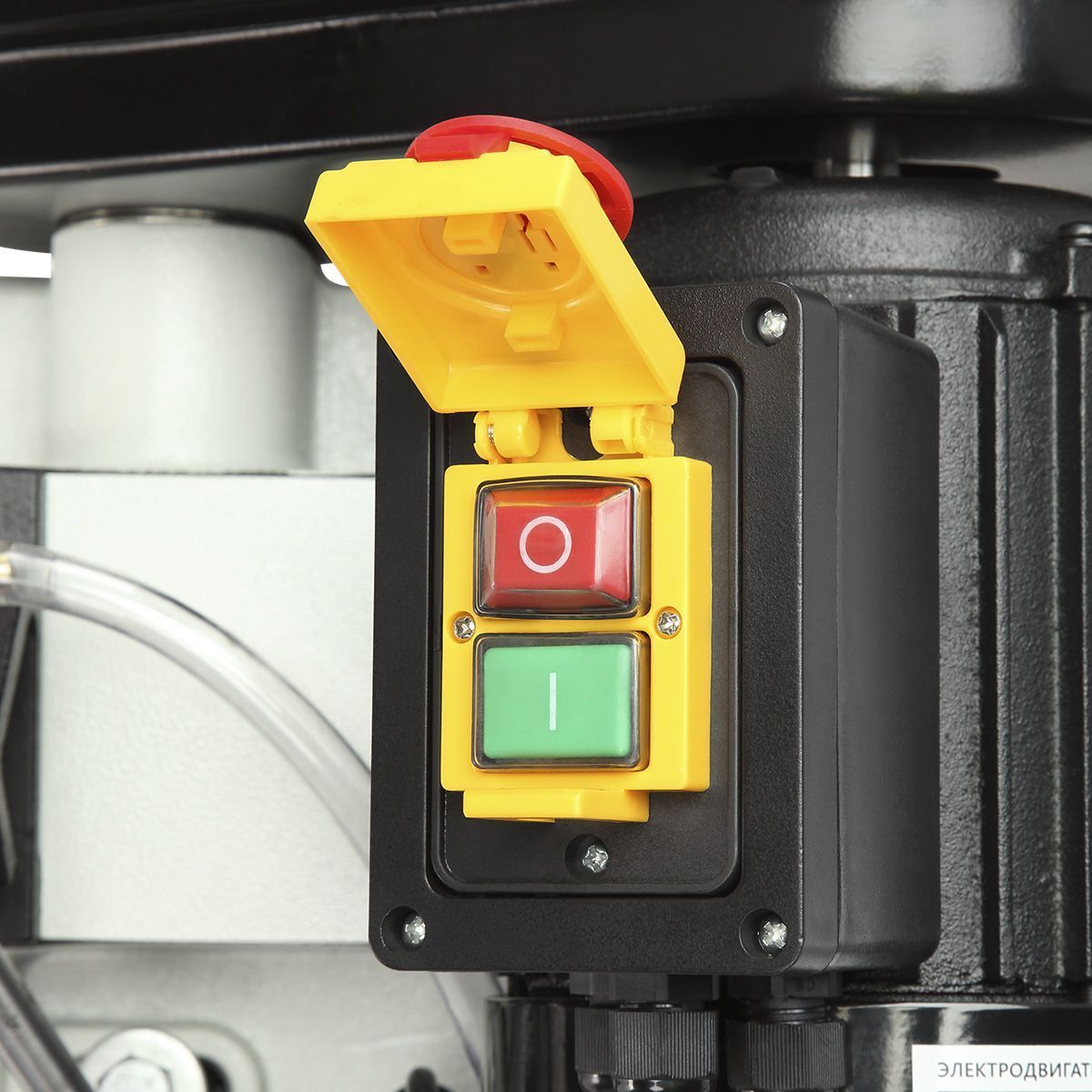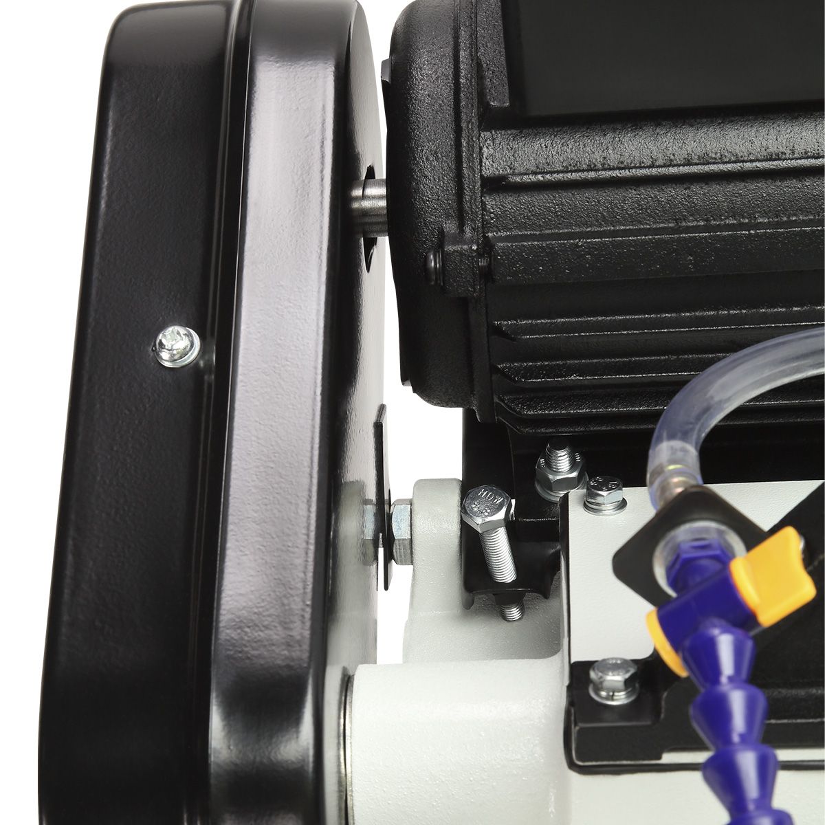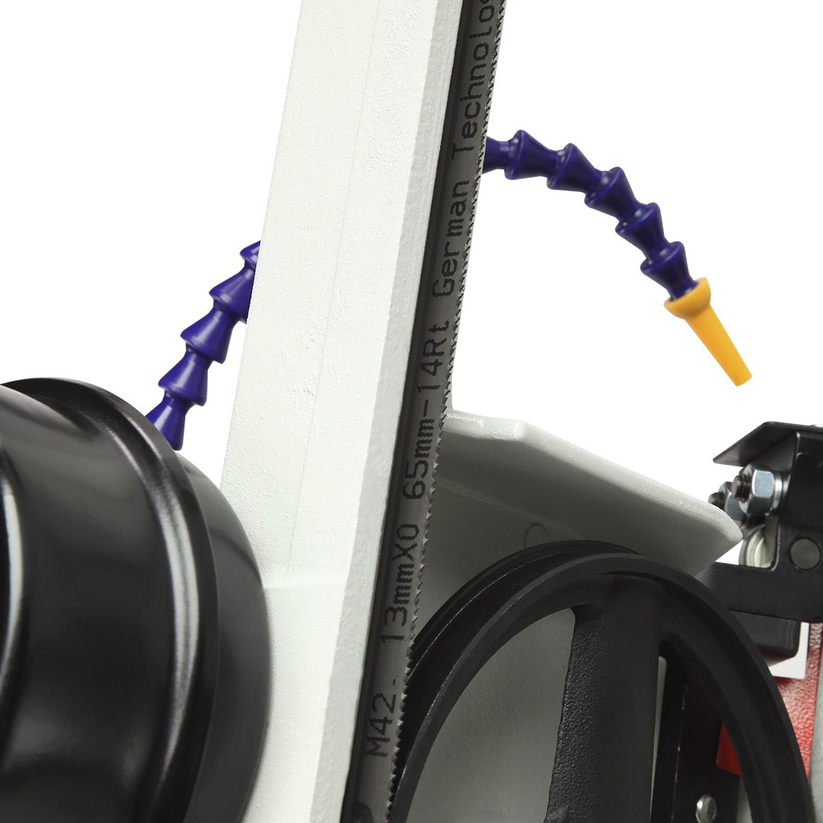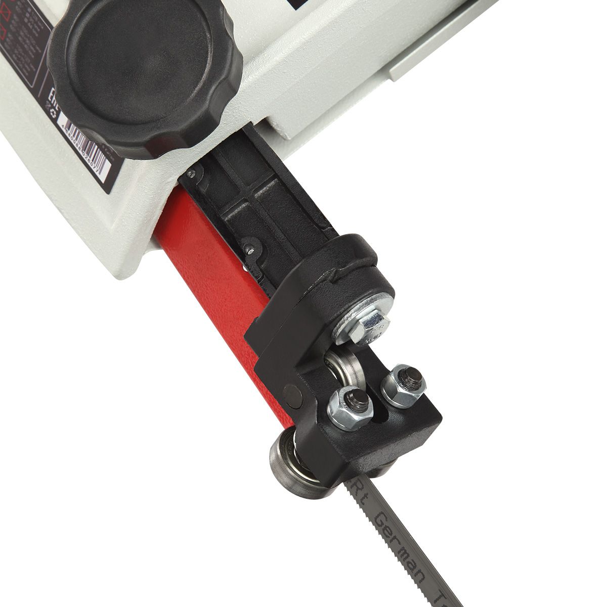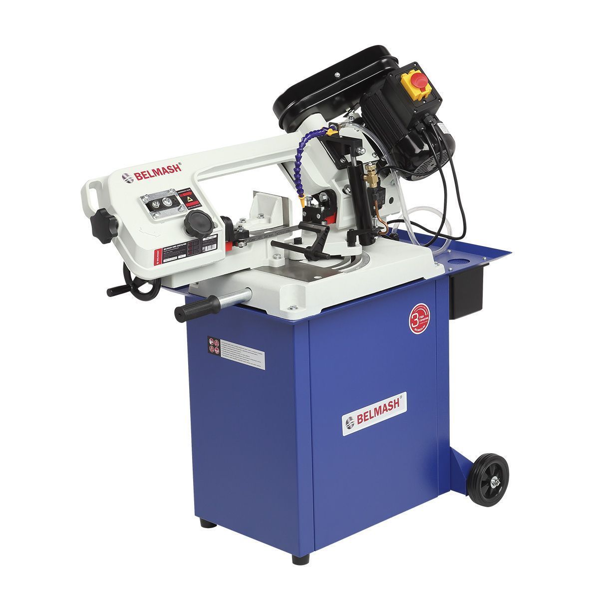 Станок оснащен мощным асинхронным двигателем 550 Вт, S1, работающим от сети 230/380 В. Переключение между тремя скоростями резания 20/29/50 м/мин осуществляется простым перекидыванием клинового ремня. Натяжение пильного полотна регулируется специальной ручкой, что обеспечивает стабильную работу и продлевает ресурс оборудования.
