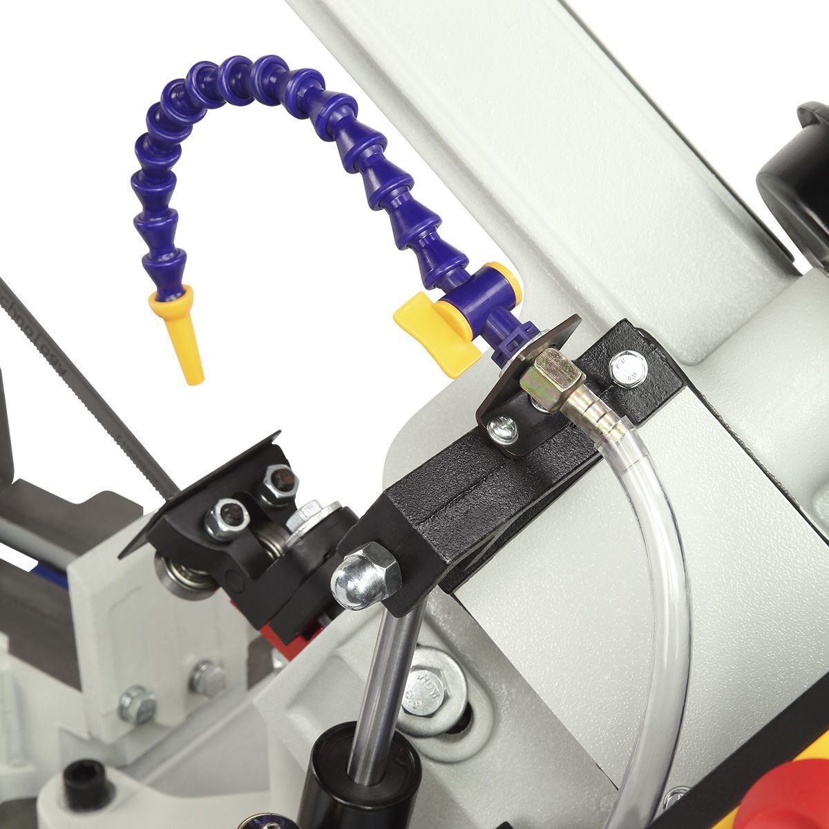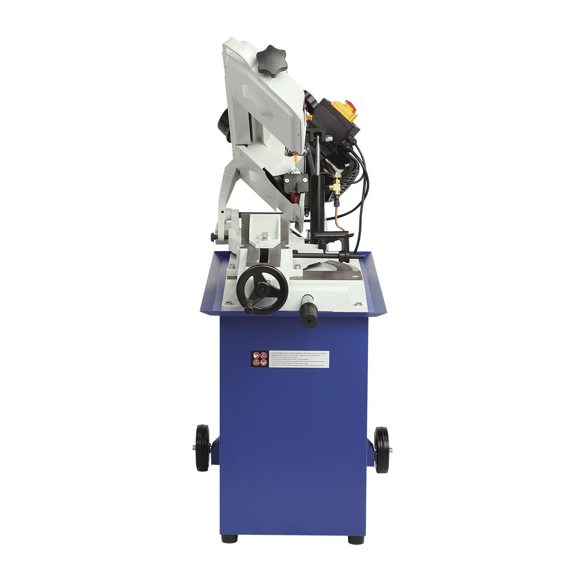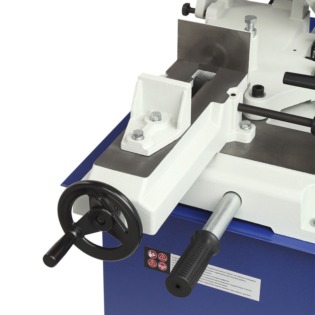На прочном основании из листовой стали установлена массивная пильная рама из чугуна. Такая конструкция обеспечивает устойчивость станка во время работы и эффективно гасит вибрации, что особенно важно при обработке твердых металлов.