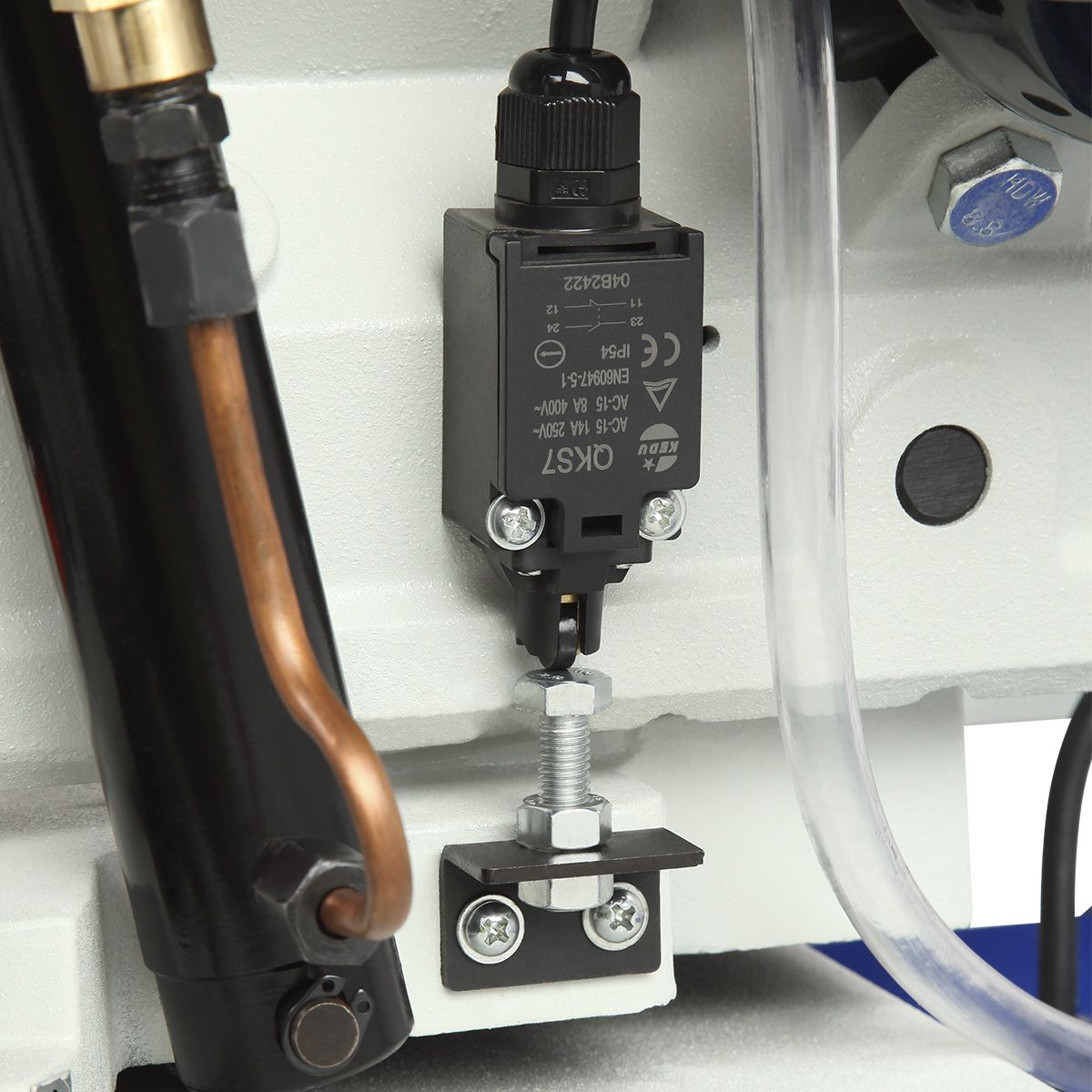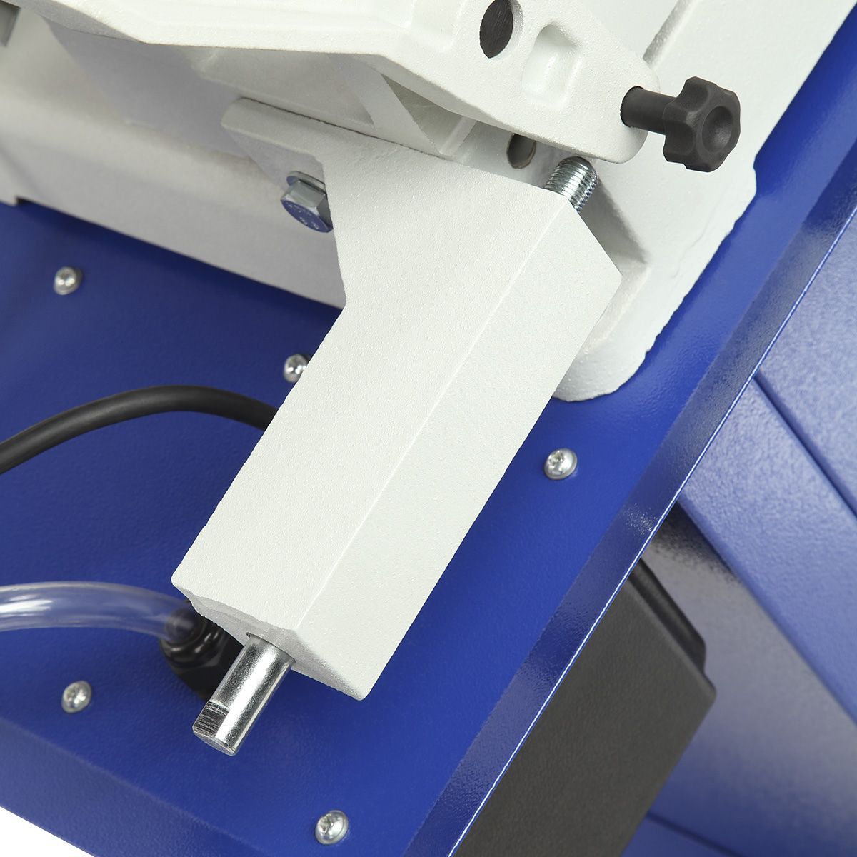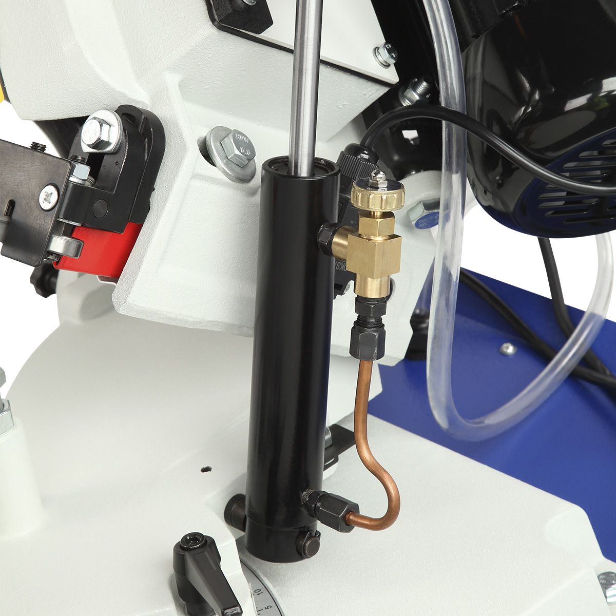 Пильная рама опускается с помощью гидравлической системы, скорость подачи которой можно регулировать клапана на гидроцилиндре. Это позволяет адаптировать станок для работы с разными материалами. После завершения реза автоматический выключатель останавливает пилу, что значительно упрощает процесс, особенно при серийном производстве.