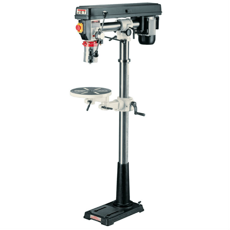 Радиально-сверлильный станок JET JDR-34FM для напольной установки. Модель предназначена для эксплуатации в ремонтных мастерских с небольшими объёмами работ по сверлению и для использования в гараже или на даче в любительских целях. Конструкция сверлильной части позволяет менять вылет (расстояние до колонны) и наклон. Рабочий стол тоже не совсем обычный: он круглый и поворотный. Стандартные регулировки по высоте и по углу тоже предусмотрены. Такой набор возможностей по настройке позволяет устанавливать самые разные по форме и габаритам детали, а также точно сверлить отверстия в ряд или по окружности