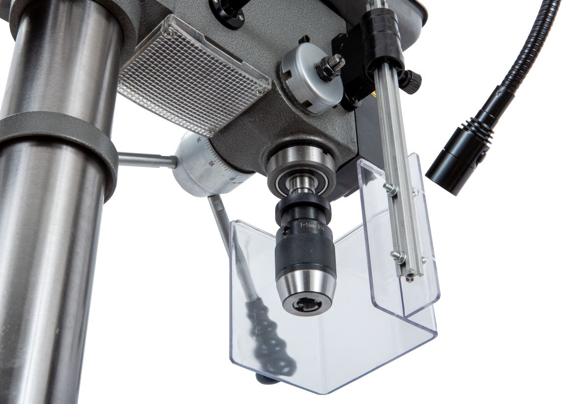 Стандартная комплектация включает в себя быстрозажимной сверлильный патрон 1-16мм/В16, защитный экран, лампу местного освещения и инструкцию по эксплуатации.