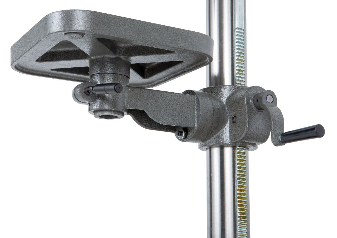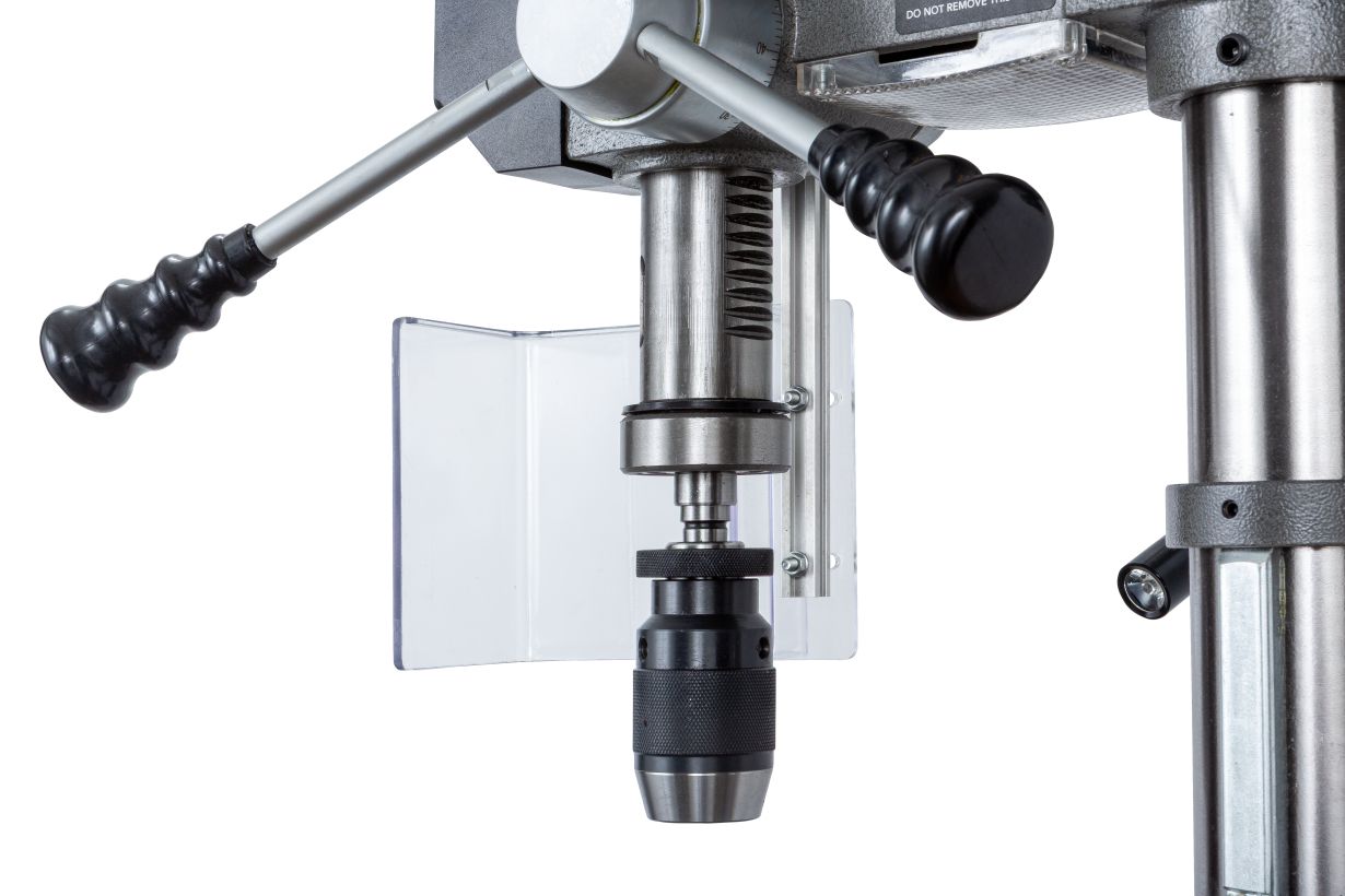Ход пиноли шпинделя составляет 80 мм. Для контроля глубины сверления предусмотрена шкала на лимбе с миллиметровой разметкой, а также стопорный зажимной винт для ограничения хода пиноли.