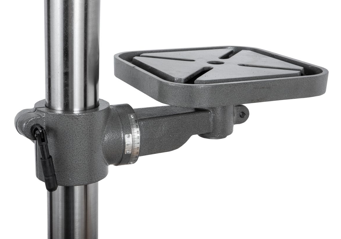 На основание установлена колонна диаметром 73 мм с зубчатой рейкой для возможности перемещения стола по вертикали. Рабочий стол, как и основание, изготовлен из качественного чугуна, его размер 270х270 мм с 4-мя Т-образными пазами, расположенными крест-накрест, ширина пазов 15 мм. Максимальное расстояние между шпинделем и основанием составляет 690 мм, а расстояние между шпинделем и рабочим столом – 465 мм.