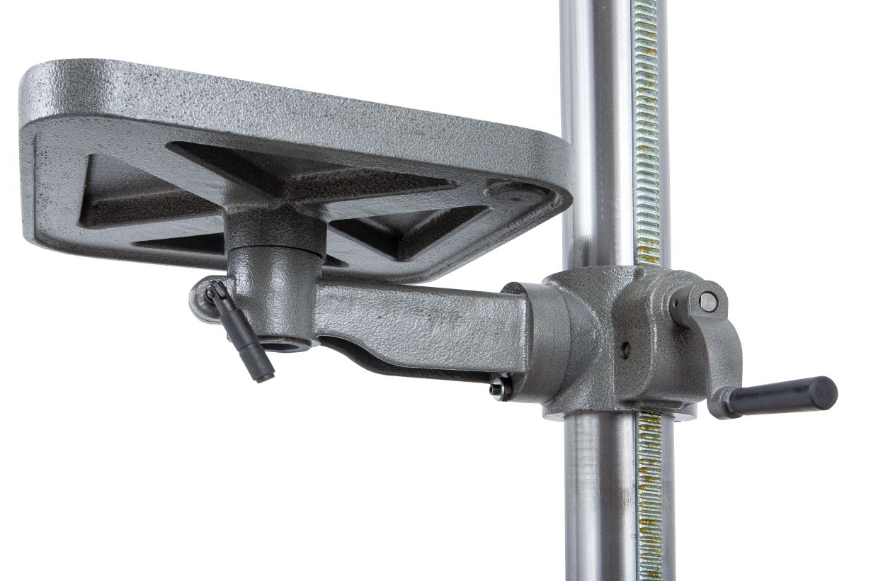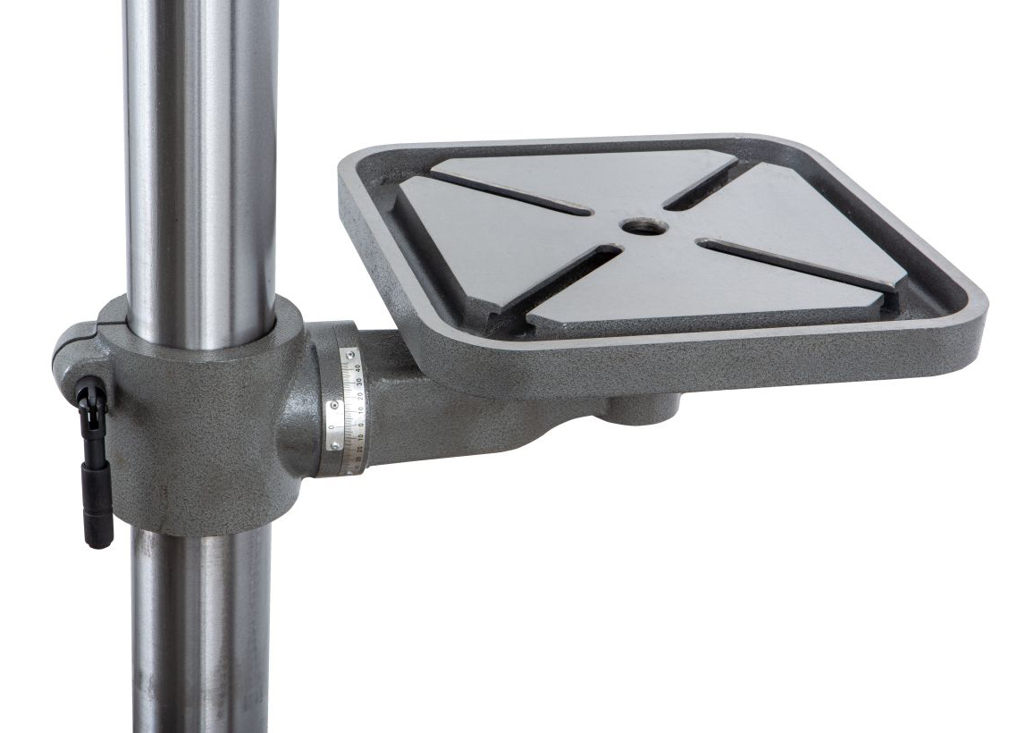 На основание установлена колонна диаметром 80мм с зубчатой рейкой для возможности перемещения стола по вертикали. Рабочий стол, как и основание, изготовлен из качественного чугуна, его размер 315х315 мм с 4-мя Т-образными пазами, расположенными крест-накрест, ширина пазов 15мм. Максимальное расстояние между шпинделем и основанием составляет 1220мм, а расстояние между шпинделем и рабочим столом – 720мм.