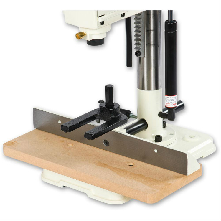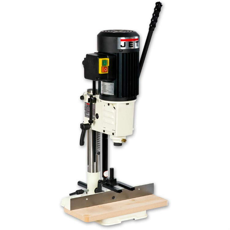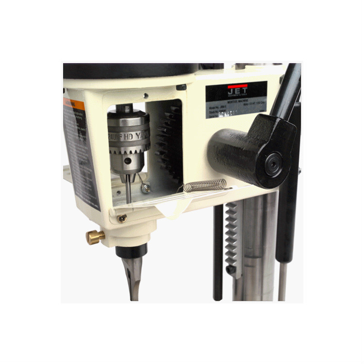 Будучи компактным и мобильным, JBM-5 оснащён всеми механизмами и системами, облегчающими работу. Есть газовая стойка для компенсации веса сверлильной части, реечный механизм подачи с длинным рычагом, продольный упор и вертикальный прижим заготовки. Простота и точность установки сверла-долота обеспечивается комплектом переходных втулок - достаточно выбрать нужную и зажать внешнюю часть винтом, предварительно сориентировав плоскость по упору заготовки. Для фиксации сверла предусмотрен трехкулачковый патрон с удлиненным ключом