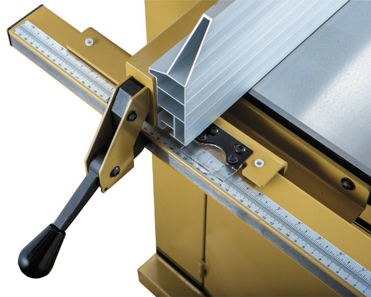 В комплект поставки станка входит параллельный упор с кронштейном и направляющим профилем. Фиксация производится эксцентриковым зажимом с длинной рукояткой. Сама планка выполнена в виде плоской широкой панели. Ее можно установить вертикально (удобно при работе с тонкими и высокими заготовками) или плашмя. При пилении с одинаковым отступом от края криволинейной заготовки используют цилиндрический штифтовой упор, который монтируется на основание параллельного упора вместо широкой планки. В поверхности рабочего стола Т-образный паз для скользящего углового упора (входит в комплект поставки)
