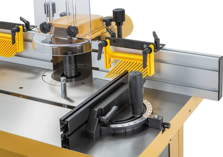 Фрезерный упор имеет усовершенствованную конструкцию с увеличенными накладками из алюминиевого профиля. Для регулировки его сдвигают целиком, ослабив два фиксатора. Винтовой механизм с миллиметровой шкалой позволяет отдельно настраивать положение задней накладки (величиной выступа регулируют глубину съёма). В качестве верхних прижимов заготовки используются пластиковые «гребёнки», в том числе страхующие от обратного выброса