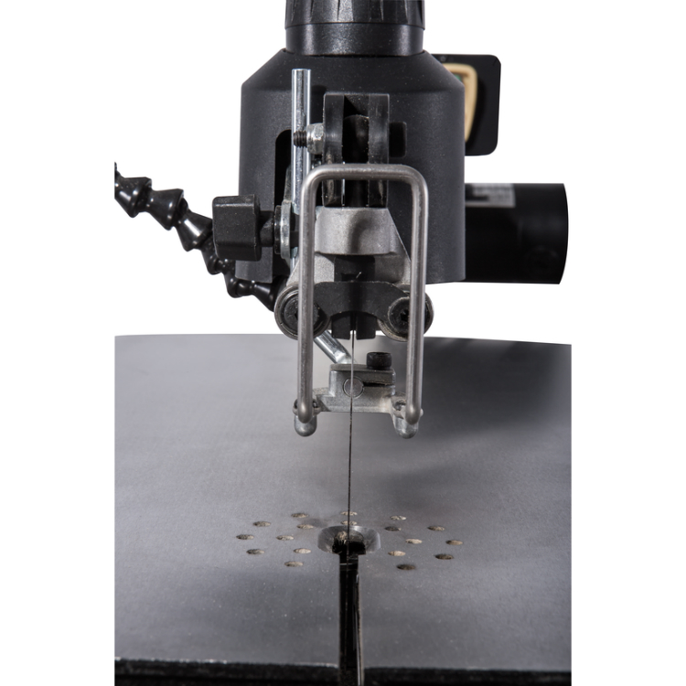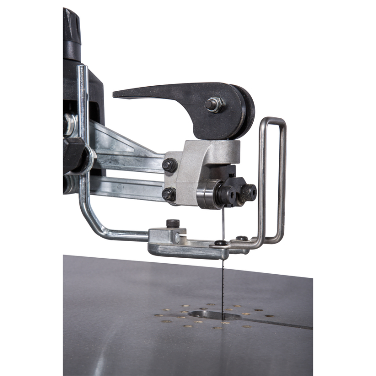 Станок работает с пильными полотнами без штифта. Верхняя часть пилки зажимается эксцентриковым механизмом, совмещенным с натяжителем, нижняя предварительно зажимается в адаптер, а после вставляется в вилку-оправку. В комплекте два таких адаптера, что позволяет иметь в быстром доступе полотна разных типов. Благодаря наличию прорези в рабочем столе существенно упрощается установка на стол заготовок с продетой пилкой