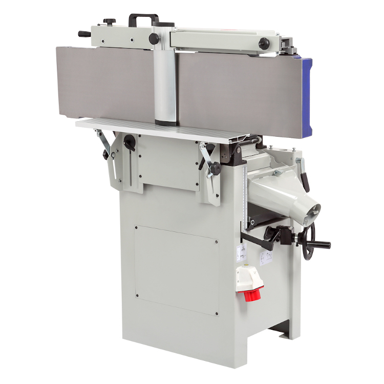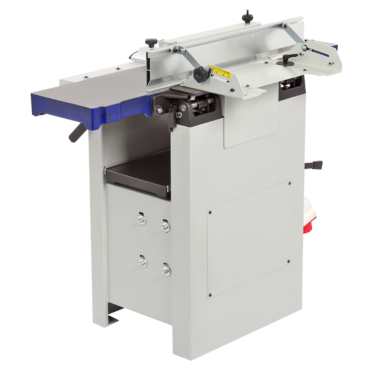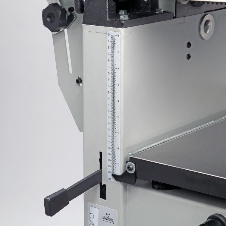 Отдельного внимания заслуживает удобный эксцентриковый механизм регулировки положения столов, причем как подающего, так и принимающего. Входящий в базовое оснащение стальной трехножевой строгальный вал прост в эксплуатации (имеет стандартные регулировки), а за счет частоты вращения в 5500 об/мин. обеспечивает чистый рез. Для строгания по торцу или под глом от 90 до 45 градусов станок оборудован параллельным упором, который выполнен в жесткого алюминиевого профиля. При выборе между двумя специализированными или одним комбинированным станком нужно учитывать, что эта модель точна, удобна и производительна, как специализированные, но потребует несколько более частого обслуживания рейсмусовой части в случае интенсивной эксплуатации.
