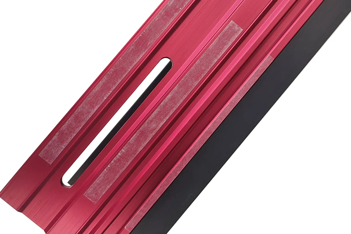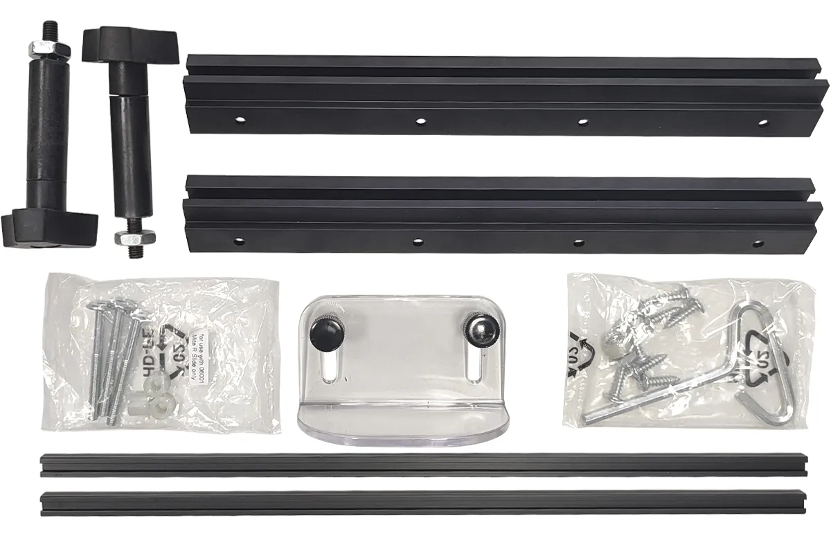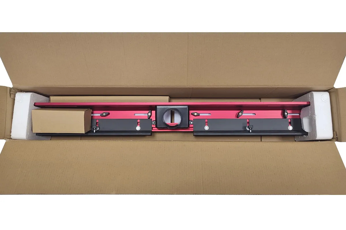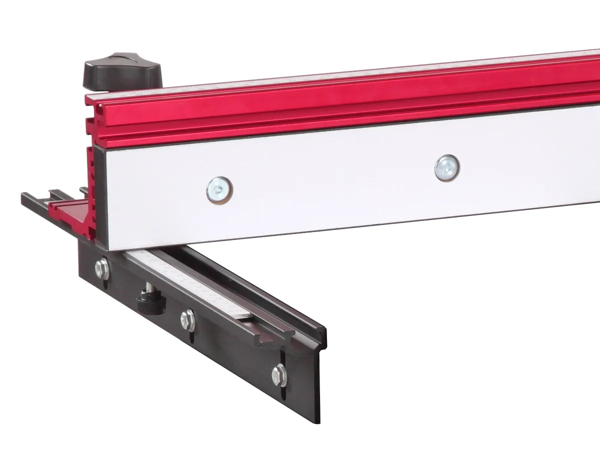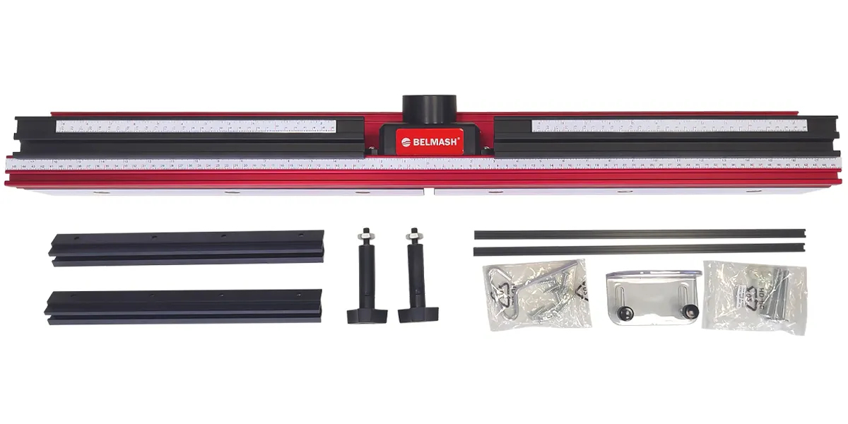 В комплекте с упором имеются направляющие с регулируемыми шкалами для точного позиционирования (для транспортировки они закреплены болтами на задней части упора). Они устанавливаются по бокам фрезерного стола длиной 800 мм (например, рабочий стол RT800 имеет параметры 800×600 мм). Но упор можно закрепить и другим способом. Для этого на нижней части основания упора сзади имеются два паза 110×10 мм каждый (расстояние между пазами - 628 мм). Кроме того, низ упора имеют шесть силиконовых накладок для плавного перемещения.